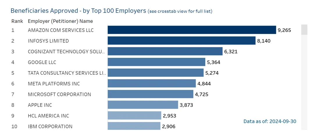 该名单涵盖了从2009财年到2024财年(第4季度)期间,各大公司提交的H-1B申请数据。经过移民局的整理后,所得出的一份权威且具有参考价值的H-1B雇主名单。