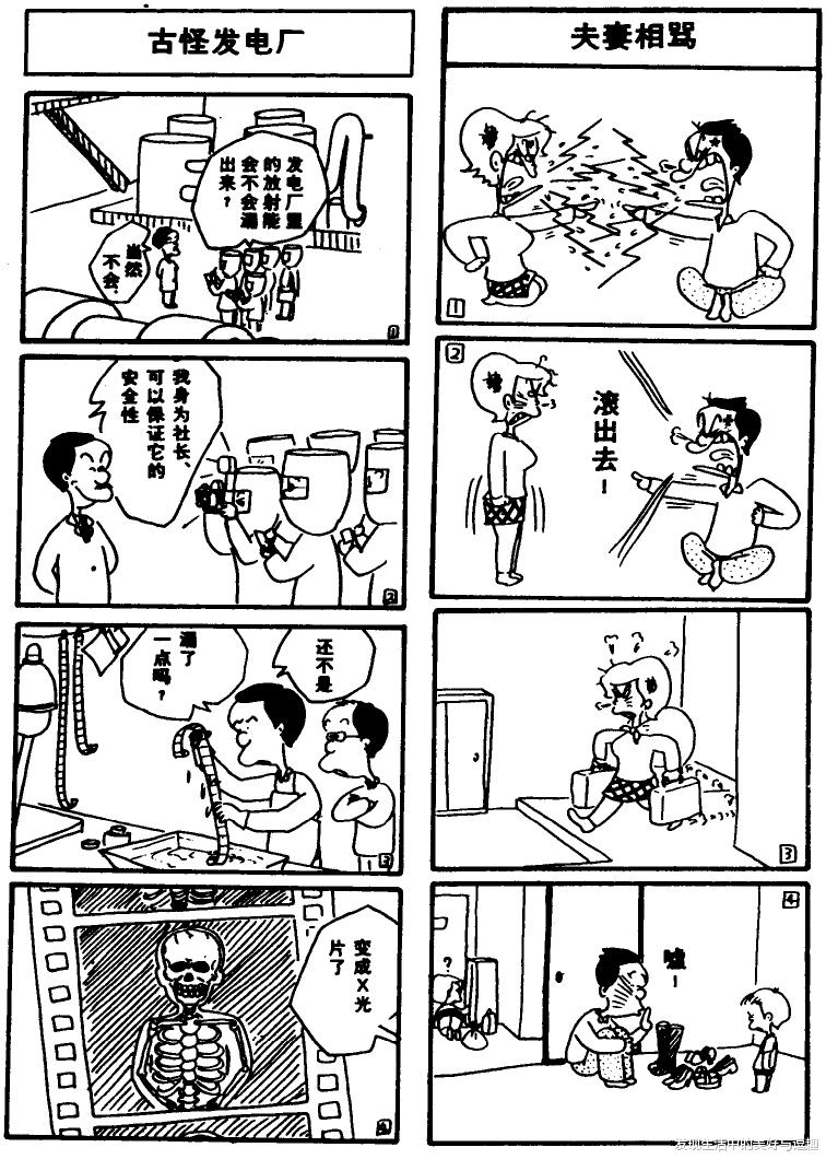 发电厂一群记者穿着防辐射的衣服和帽子来采访,社长拍胸脯保证没有辐射很安全,记者回来洗照片显示把社长拍成了骨架,都变成了x光片了,哈哈真讽刺。