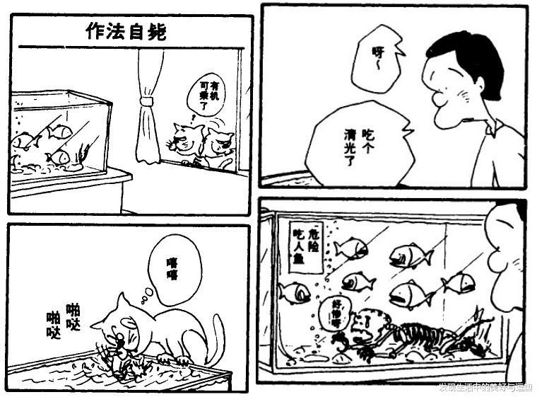 这一篇哥哥曾跟我说过印象深刻,一只猫看四下无人,跑到鱼缸上准备捞条鱼,过一会儿主人过来看吃了个精光,在读者以为鱼缸里的鱼都被猫吃了情况下,最后展现的是猫被吃的仅剩骨头架子,浴缸上贴着警示语“危险 食人鱼”