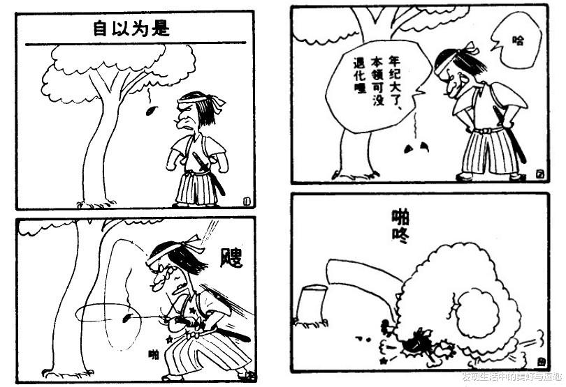 枯叶飘落,老剑客瞬间出剑,落叶化为两半,老剑客自叹年龄虽大功力可没减,是没减,树都被他砍成了两半砸到了自己。真应了那句话莫装* 装*遭雷劈。