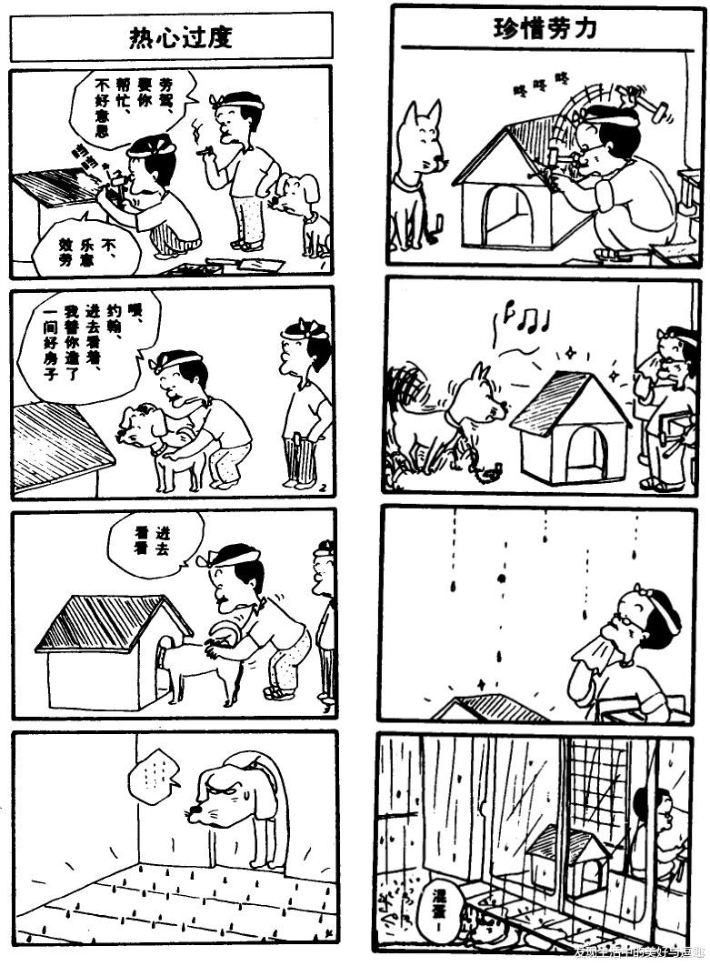 这两幅本来不是放在一起的,但我觉得说的是一个事儿就拼在一起了。都是给自己的爱狗做狗窝,一个是窝里的地板全被钉子砸穿了,另一个是本来做好的窝,狗以为自己有新狗窝了,正等着入住,没想到下雨了,主人把狗窝拿进屋里,狗却在屋外的踏板底下躲雨。