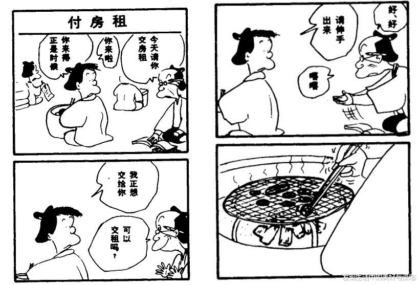 房东来要房租,租客说你来的正是时候,请伸出手来。房东欣喜地伸手,想不到收租这么顺利。租客手拿筷子从火烤的篦子上夹起烧得通红的钱币……