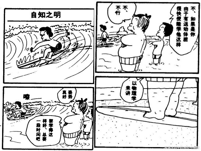 海边两个人看海里的人冲浪,赞叹道姿势真好,胖子说要学成这样好得练一段时间吧?另一个说不,如果你有运动体质应该很快就能学成他那个样子。胖子很淡定的说,不,不行,以物理学的角度:他脚下的冲浪板被他踩在水里无法浮起……