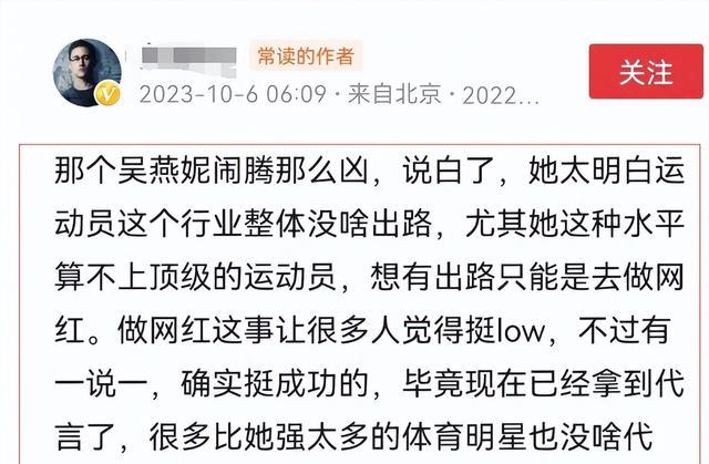 吴燕妮之所以这么闹腾,说白了是因为吴燕妮明白运动员这个行业整体上没啥出路,尤其是她这种水平的运动员算不上顶级的,想要有出路就只能去做网红,虽然网红这个名词听起来挺LOW,但吴燕妮确实做得很成功,都拿到代言了,很多明星比吴燕妮强,但都没啥代言,可能还要面临尴尬的退役生涯。