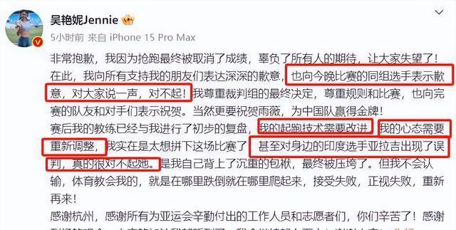 10月2日凌晨,对于吴燕妮也是比较煎熬的一晚,当天晚上吴燕妮就为抢跑专门发布了道歉,向比赛的同组选手以及支持她的观众表示道歉,也对比赛时身边的选手亚拉吉表示抱歉。深刻反省了是由于自己心理上存在很沉重的包袱,才导致抢跑的出现。