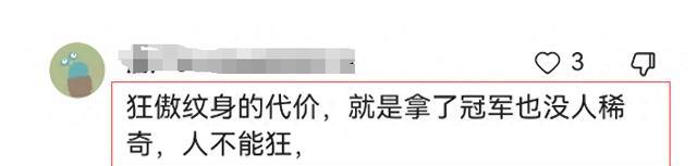 甚至还有不少人攻击吴燕妮的纹身,认为吴燕妮和比赛时以手指指天的手势,认为吴燕妮太过高调,就算是获得冠军也没人稀罕,这种指责,实在让人啼笑皆非。