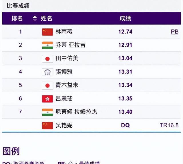 最终,中国选手林雨薇以12秒74的成绩夺冠,而吴燕妮也跑出了12秒77的成绩,拿到了银牌,但由于抢跑被坐实,银牌被取消,由亚拉吉替补,获得了银牌。