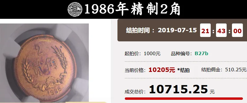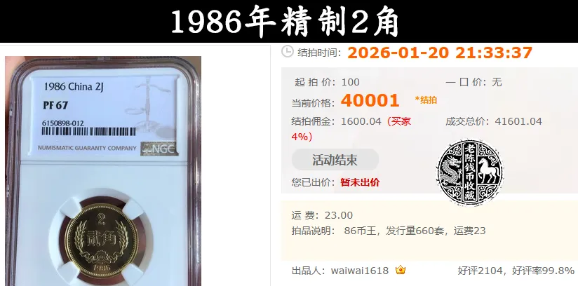 也就是上面这枚1986年的2角硬币,在今年1月20号的现代钱币现代拍卖会网拍上,以4.16万元的成交价格被拍出。