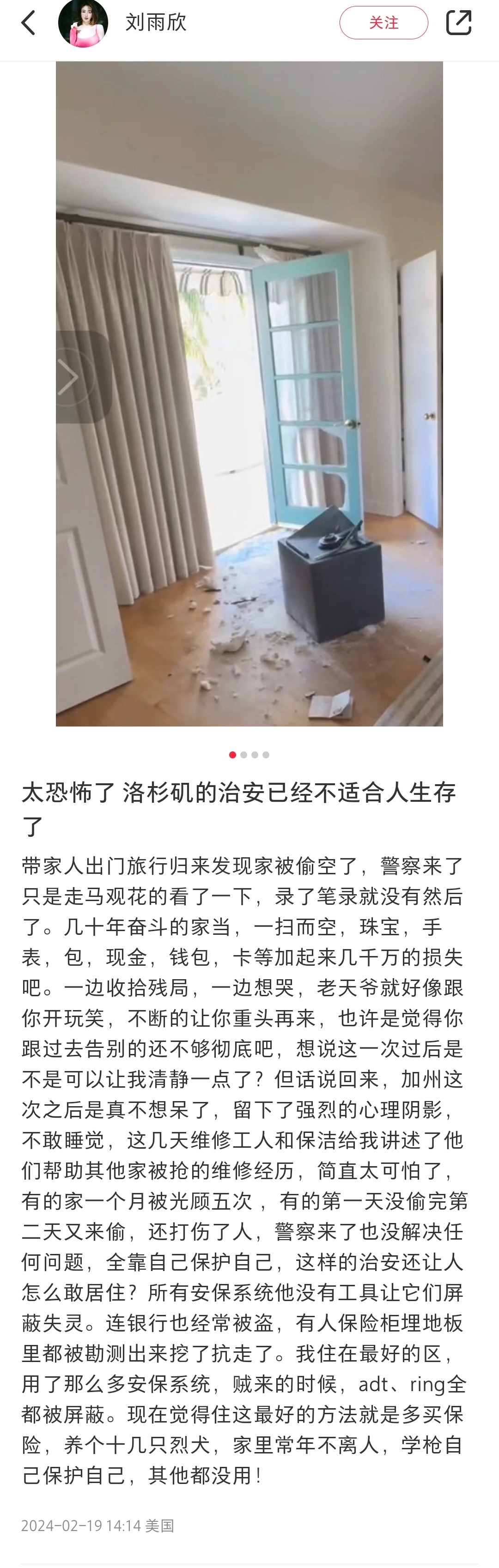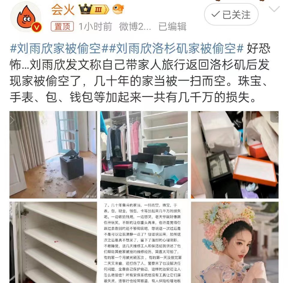 著名演员刘雨欣近日通过社交媒体发文,分享了一起令人震惊的盗窃事件。她表示,在与家人进行一次旅行并返回美国加州洛杉矶的家中后,发现家中遭受了严重的盗窃。根据她的描述,这不仅是一次简单的入室盗窃,而是一场彻底的洗劫。她指出,家中珍藏的珠宝、手表、名贵包包、钱包等贵重物品全部不翼而飞,初步估计损失达数千万人民币。
