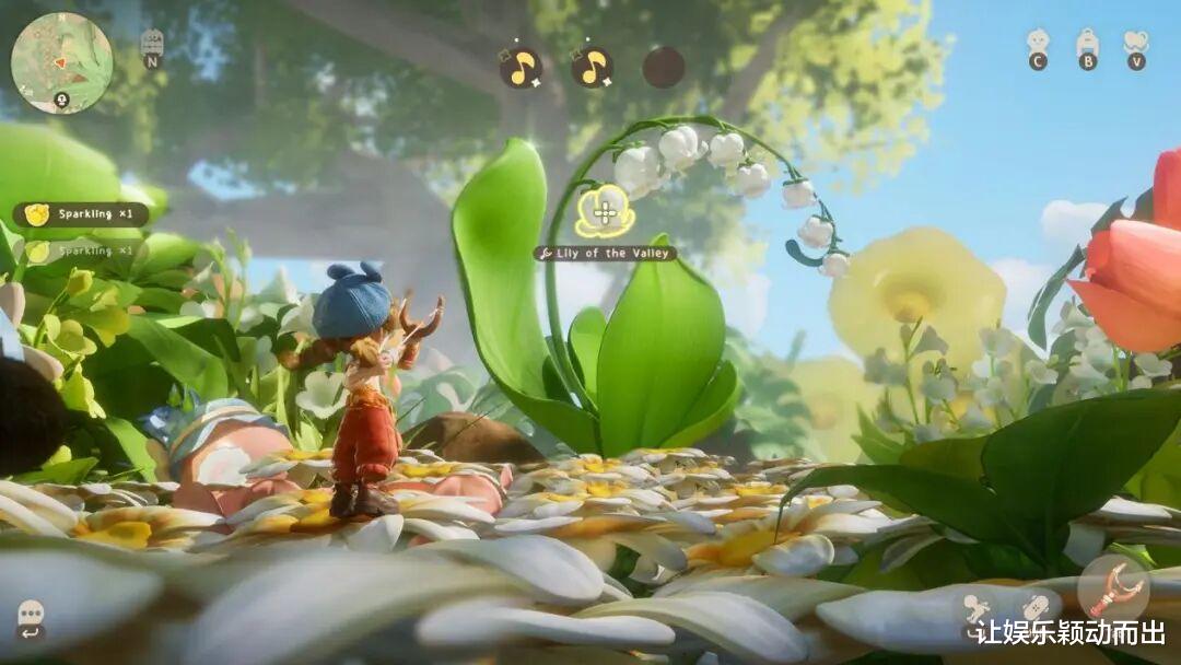 目前,游戏仅展示了一张大地图花海。花海的视角和风格与室内场景保持了一致,都让玩家的角色更像一只渺小的昆虫。花海中的花朵和昆虫都有可采集的资源,这些构成了玩家探索这张大地图时主要的驱动力。