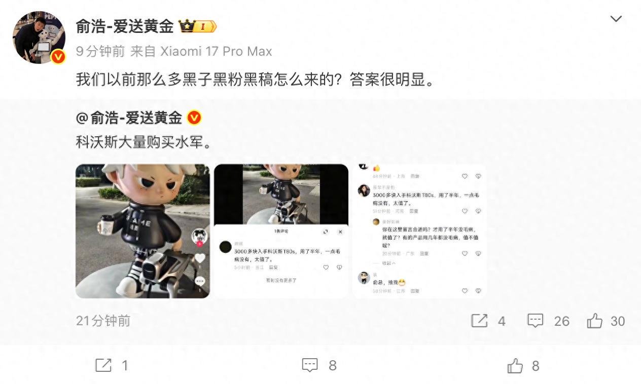 值得注意的是,今天上午,追觅CEO俞浩在社交媒体平台指责科沃斯大量购买水军抹黑追觅。俞浩晒出的截图显示,有多位“水军”在追觅相关的短视频评论区留言称,“3000多块入手科沃斯T80s,用了半年,一点毛病没有,太值了。”