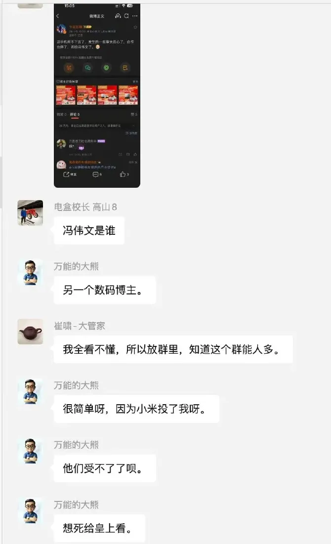 01“米粉”的刀,捅向了自己人事件的导火索,源于一张广为流传的社群聊天截图。截图显示,长期批评小米品牌及“米粉”群体而闻名的争议博主“万能的大熊”,在某群聊声称“另一个数码博主受不了,因为小米投了我呀”。此言一出,立即在小米各核心粉丝社群中投下震撼弹。