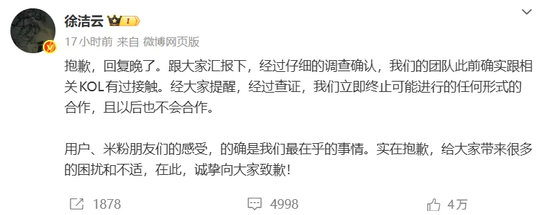 当晚,小米公关部总经理徐洁云发布微博,公开致歉。他承认此前团队在执行过程中,确实与该博主(万能的大熊)有过接触,但目前已“第一时间终止”了任何形式的合作,并且承诺“后续也永远不会再有任何合作”。