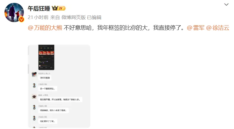 他更进一步点名道:“@万能的大熊不好意思哈,我年框签的比你的大,我直接停了。@雷军@徐洁云”。