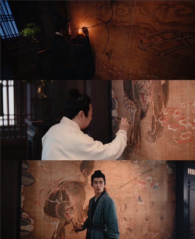 结局之际,又发现了一个堪称点睛之笔的镜头表达,用一幅画暗示了神捕营三代人的传承。钟云赤身上背负着大亓的秘密,他是海崖惨案的制造者之一,作为亲眼见证过海崖沦为人间地狱的人,内心充满愧疚但又不得不将真相掩藏,因此只能绘制一幅地狱图,一是为惨死的海崖百姓申冤,二是用无声的方式讲述这个无法通过自己的力量去揭露的真相。在他绘制了烈火、鬼差和众生后,留下了下山虎——那正是真相的化身。后方天正继笔,绘就虎躯却难点睛,暗示他与诸葛通对于所谓真相,触手可及却迷雾重重。直至萧北冥落笔点睛,尘封的真相方如虎目圆睁,豁然明朗,看懂这段暗线时真的浑身起鸡皮疙瘩。