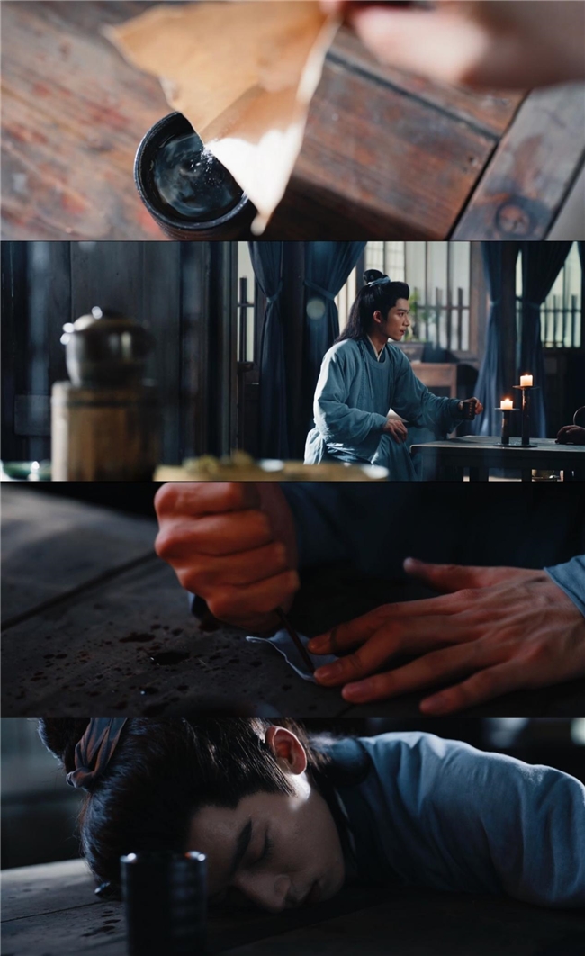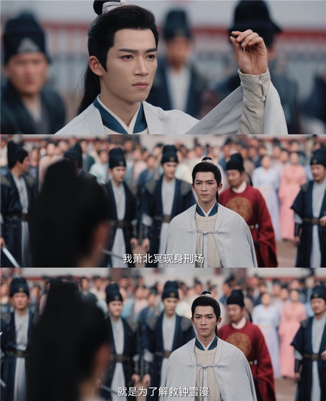 萧北冥三次服毒的表达更是妙上加妙。第一次服毒是在作为夜煞现身时,萧北冥毫不犹豫地服下钟雪漫递来的毒药,不问目的,不问来源,因为此时的他相信,师妹的心中总会存有一丝信任,这是为信;第二次服毒是在法场众目睽睽下,自己服下毒药,不留退路,用以命换命的办法助师妹脱离困境,这是为义;第三次服毒是在寻找吴锥大人时,为求海崖与参风甲真相,主动饮下那杯毒药。在“毒发”之际,萧北冥将所获线索艰难地写在布条,装进蜡丸吞下,这是神捕营留下的规矩,更是展现了作为一个好捕快该有的样子。“秘密可以烂在肚子里,但真相——它不能”,这是为真相。萧北冥从来不是不怕死,但相比所追求的信义与真相,死根本算不了什么。到底有谁懂这种反过来品细糠所带来的冲击力,真的直接给跪了!