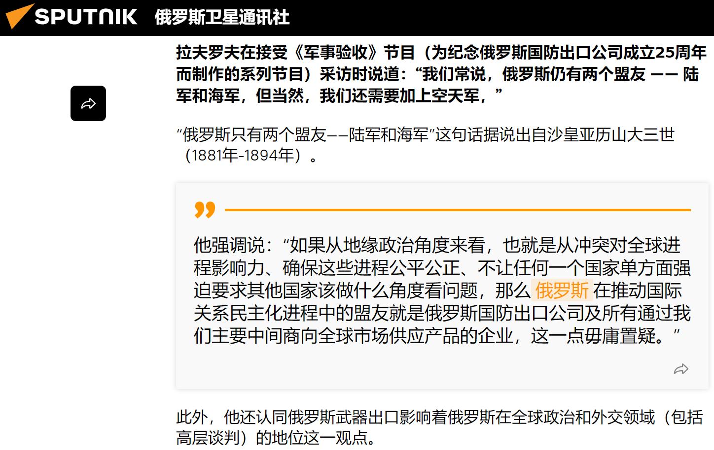 第三,拉夫罗夫援引沙皇的一句名言叫板美国,称俄罗斯仍有三大盟友,他们是陆海空三军,如果不想被别国强迫,那就只有俄军可以帮助实现公正。