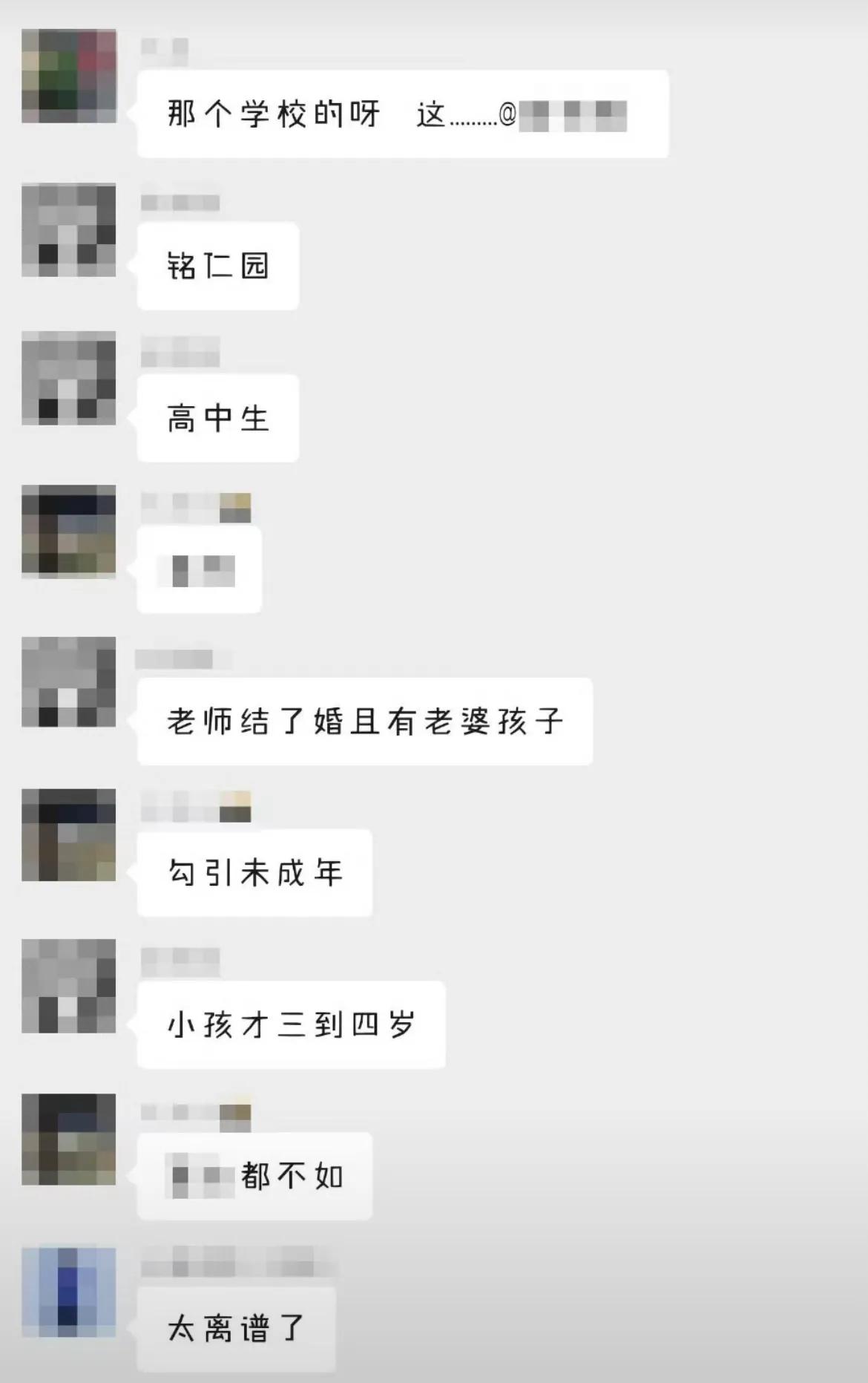 有知情人士爆料,这名男老师是铭仁园中学的老师,已婚状态,孩子三四岁了,老师的妻子现在怀着二胎,已经两个月了。