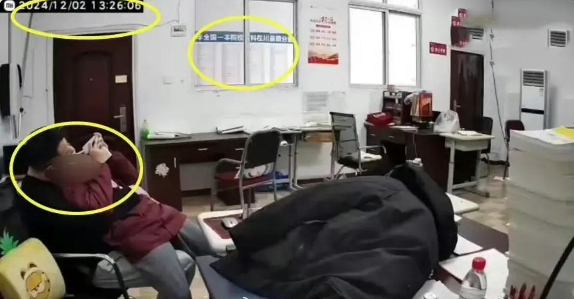 从监控视频中可以看到一名三十多岁的男教师坐在办公室内,一名女学生坐在老师腿上,两人举止亲密。