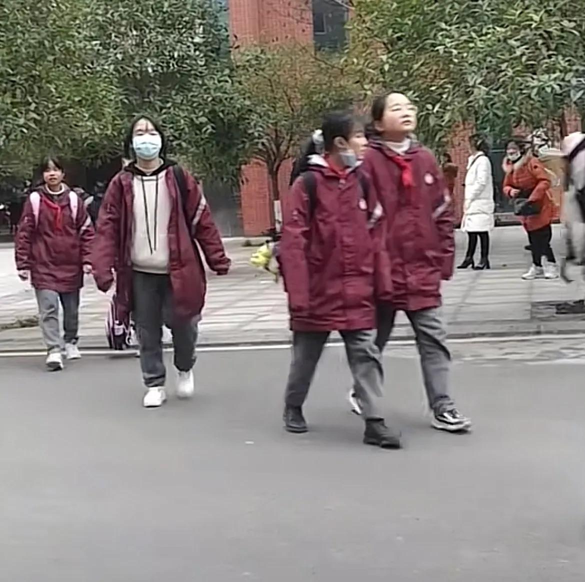 可以看到达州铭仁园中学的冬季校服是红色的长款羽绒服。校服裤子统一是灰色的运动裤。