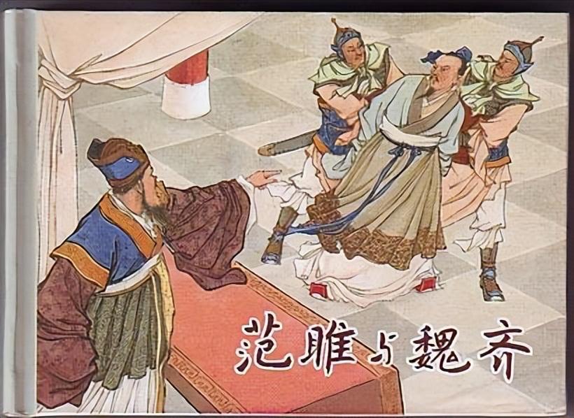 当须贾代表魏国出使秦国时,范雎故意穿着破旧衣服去见故主。须贾见他如此落魄,心生怜悯,赠他一件绨袍。后来发现范雎就是秦相张禄时,须贾吓得磕头求饶。范雎说:“我本可杀你,但念你赠袍之情,饶你不死。”他宴请各国使节,却让须贾坐在堂下,面前只有喂马的料豆,并命他告诉魏王:“速送魏齐人头来,否则血洗大梁!”魏齐最终被迫自杀。
