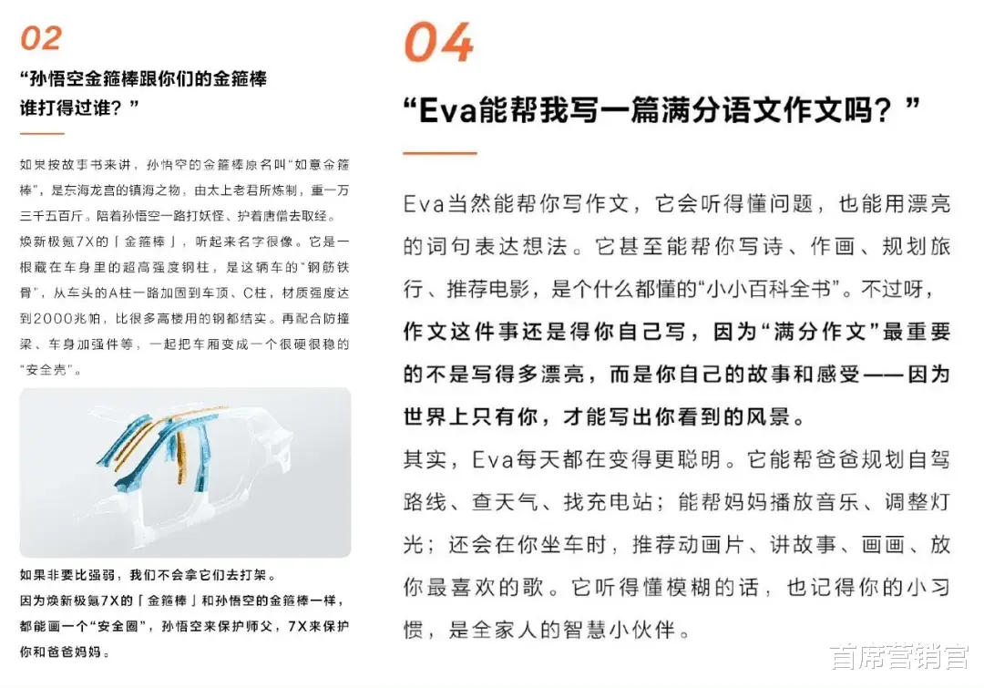 同样是广州车展期间有一幕比看新车更让人印象深刻:车评人詹志斌带着儿子来到极氪展台,看到了焕新极氪7X,本来是一场专业的产品交流,小孩哥却突然“插话”对着极氪7X总工程师蔡旭文连珠炮弹般提问:“这车的‘金箍棒’能变小放进耳朵里吗?”“孙悟空的金箍棒和焕新极氪7X的金箍棒谁更厉害?”“Eva 能帮我写作业吗?”接连抛出几个天马行空的问题,让蔡旭文当场愣了一下,一时没能给出完美回应。