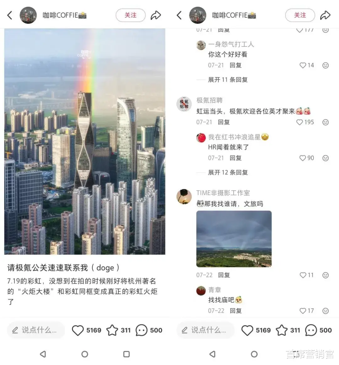小红书上有网友发了张“彩虹落在极氪大厦中间” 的照片,@极氪官微开玩笑要 “以后都能免费去大楼玩”,本以为官方只会礼貌回应,结果极氪直接转发配文“氪气如虹,见者沾喜”,还在评论区跟网友对诗:“忽见双桥落彩虹,化作极氪贯日锋”,连HR都凑过来接话“虹运当头,欢迎加入极氪”,让网友打趣道“极氪小编怕不是偷偷报了诗词班”。
