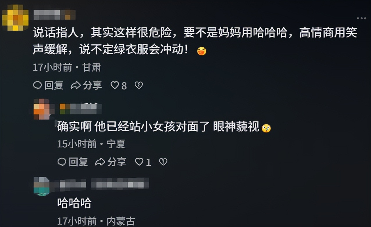 从视频中能看出,这几个外国人并没有真的把女孩放在眼里,尽管女孩说的头头是道,但身旁穿绿色衣服的工作人员明显不服,眼神轻蔑地走到女孩身边居高临下的看着女孩,想用身高差距压迫女孩,逼女孩服软,当时的情况可以说非常危险。
