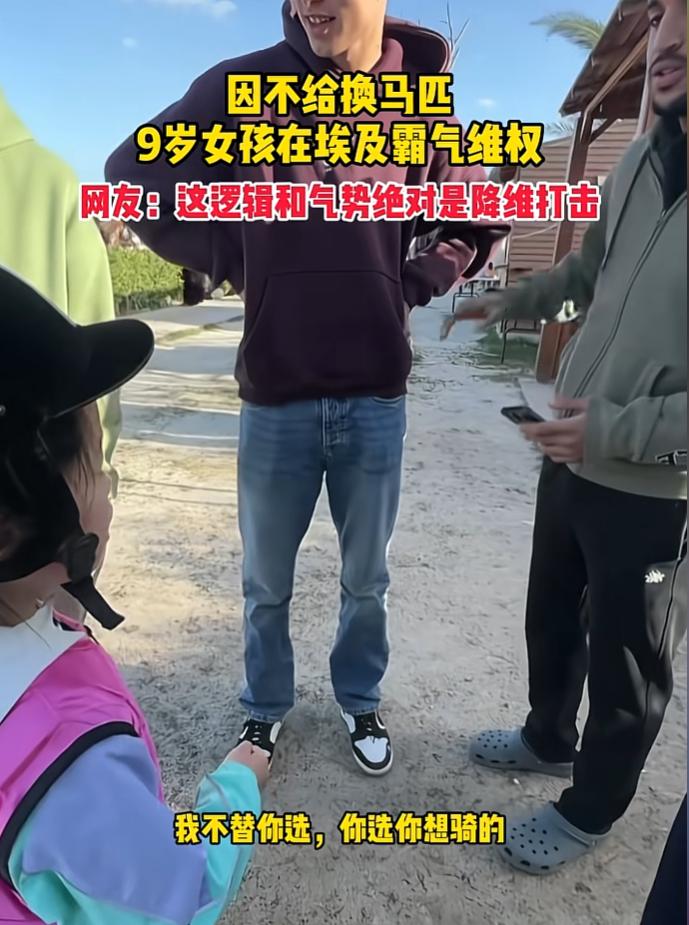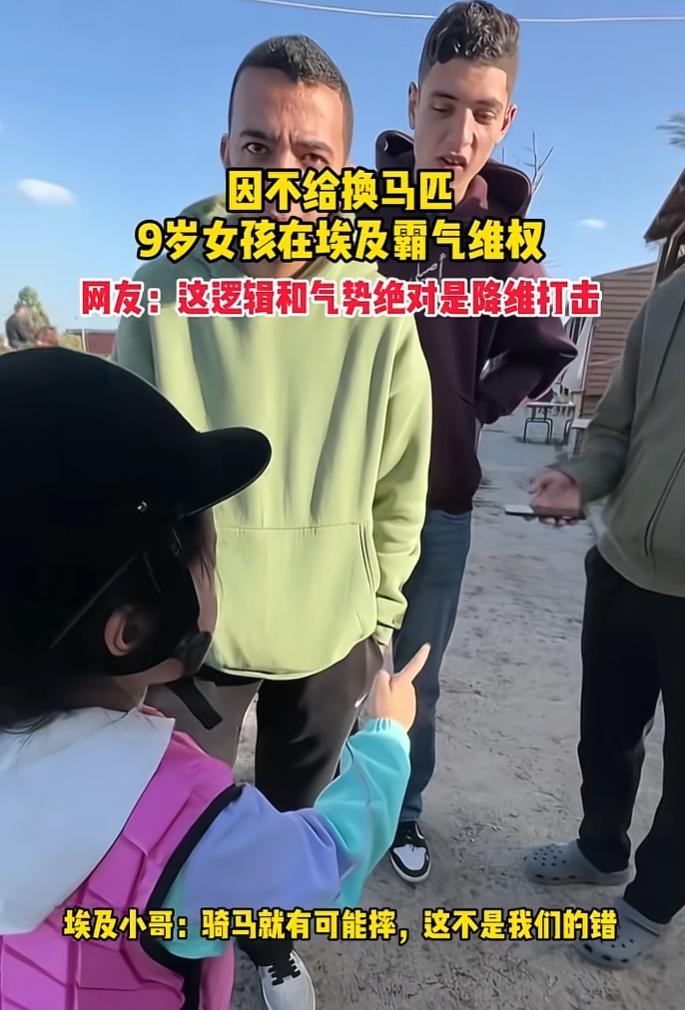 妈妈带9岁女儿到埃及旅行,期间来到当地马场骑马,女孩认为工作人员给的马不安全要求更换,可工作人员却不同意更换,对母女俩的安全漠不关心,妈妈看到工作人员的态度后就想离开,没想到女儿的举动却让人大吃一惊。