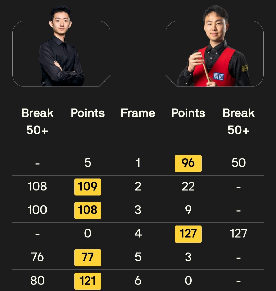 第三局,吴宜泽单杆打出100分以108:9拿下此局2-1反超徐思取得领先。第四局,徐思单杆打出127分追回一局2-2战平吴宜泽。第五局,吴宜泽单杆打出76分以77:3拿下此局3-2领先徐思。