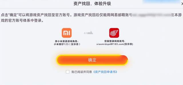 第四步,重点核对信息!登录网易账号后,一定要仔细看左边的小米渠道服角色ID,确认是自己要转移的角色,再核对右边的网易账号,确保没绑错,无误后再点击【确定】,这一步千万别马虎,避免出错。