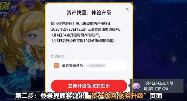 第二步,登录自己的小米渠道服账号。别看渠道服关了,登录入口还能正常使用,专门用来找回资产。登录后会弹出弹窗,直接点击【立即升级领取彩虹币】;要是没出现弹窗,就关闭游戏后台,重新启动一次,一般都能显示,多试一次不亏。