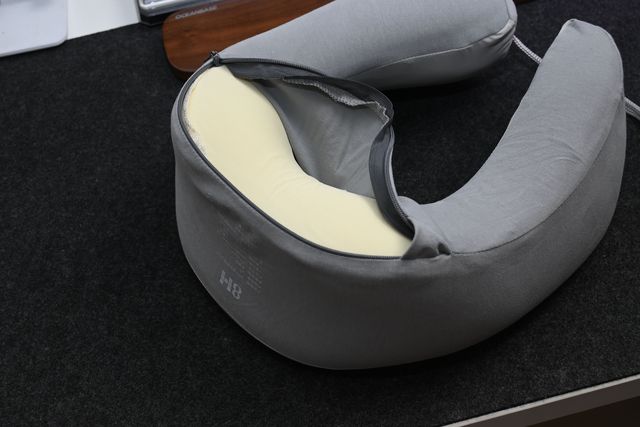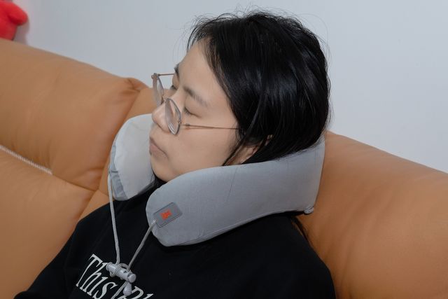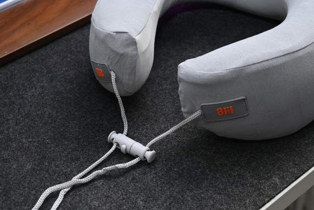 还有可调节松紧带,扣上后能微调贴合度——我脖子偏细,扣上后枕身能更紧地贴住脖子,不会松动;我同事脖子稍粗,解开松紧带也能轻松戴上,不会有勒紧的压迫感,这点比“固定尺寸”的U型枕灵活多了。
