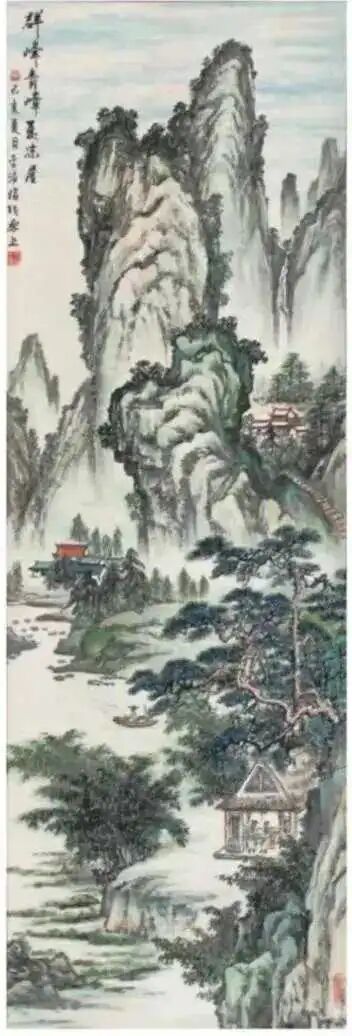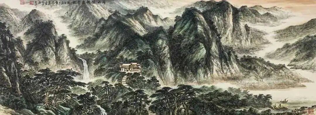 陈平治的山水作品以全景式构图为主,画面中山峦叠嶂、层林尽染,高远、深远、平远“三远法”的运用让空间层次丰富立体。从画作中能看到,他将瀑布、亭台、船只、松涛等元素巧妙布局于山水之间:飞瀑的动态打破山峦的静态,亭台的人文意象赋予山水生活气息,江面的船只则让壮阔的山水多了一丝灵动,动静结合、虚实相生间,营造出“可行、可望、可居、可游”的山水意境。这种构图既传承了范宽、郭熙等北派山水大家的雄浑格局,又融入了现代审美对画面节奏的要求,让传统全景山水焕发出新的艺术活力。