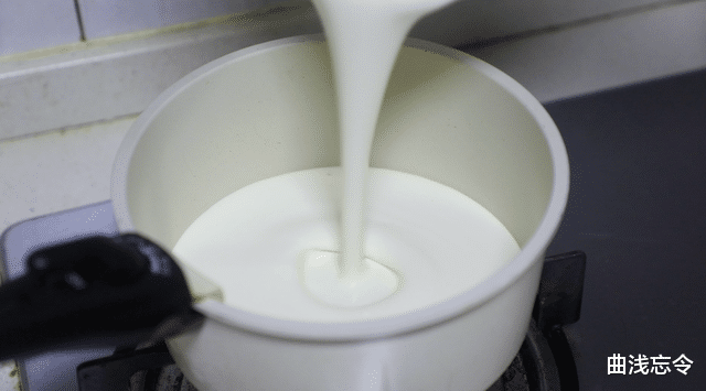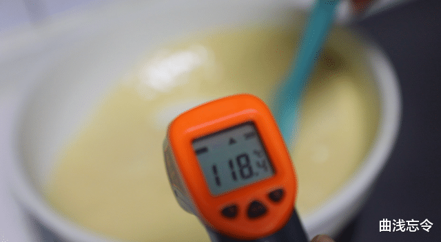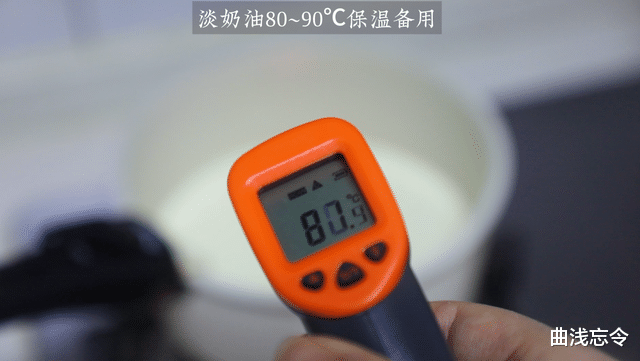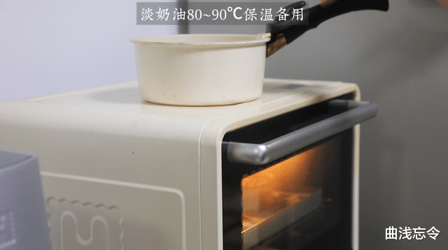 2、加热淡奶油:用小奶锅加热把淡奶油至80℃左右,放入烤箱内100℃一起保温或烤箱顶部保温。