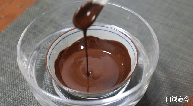 3、隔水融化黑巧克力,搅拌均匀至细腻流畅状,继续隔水保温或可放置在烤箱顶部保温。
