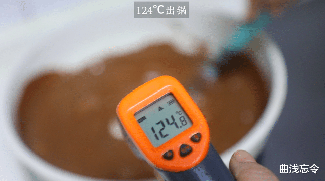 6、熬制(加黑巧液):温度在118℃时加入黑巧液,加入的时候细水长流,一边加一边要迅速的顺着一个方向搅拌,使其混合均匀。要随时观察颜色和测量温度,在118-124℃之间关火。
