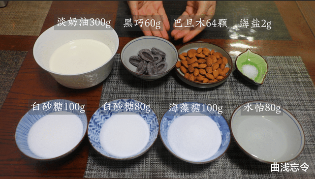 食材:淡奶油300g、白砂糖100g、海藻糖100g、白砂糖80g、水怡80g、海盐2g、黑巧60g