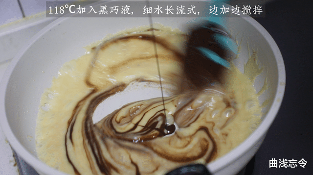 7.黑巧液加入的时候要一边加入一边快速的顺着一个方向不停搅拌,一直到黑巧液与糖液完全混合。推荐细水长流加入,避免大面积加入的温差骤变而导致不易融合的情况出现。