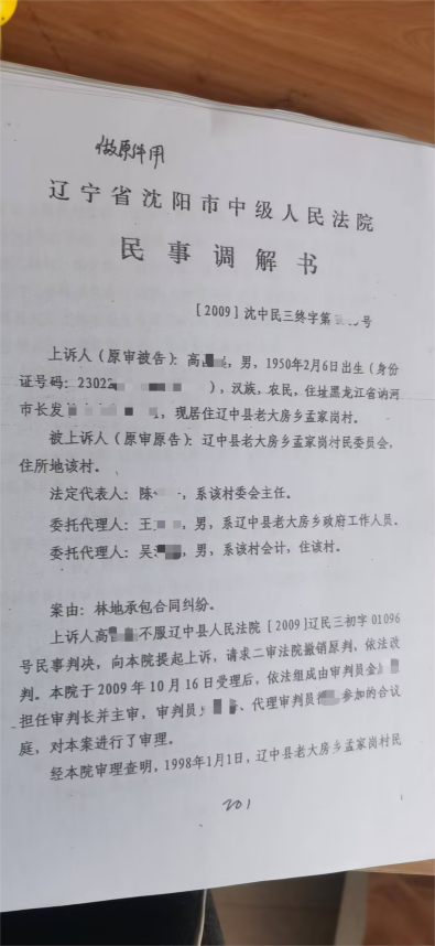 1988 年,高先生与孟家岗村村委会签订 20 年林地承包合同,承包 130 亩荒地造林。合同期内,他自费栽种杨树、樟子松、山楂树等苗木,将荒岗变成绿洲。2008 年合同到期后,因部分林木未达砍伐期,经沈阳市中级人民法院调解,双方约定 2010 年 4 月返还土地,村委会支付相应林木补偿款,退回的130亩林地不包括合同中规定的不算承包面积的亩数的防护林,还归高昌起所有,双方无异议。