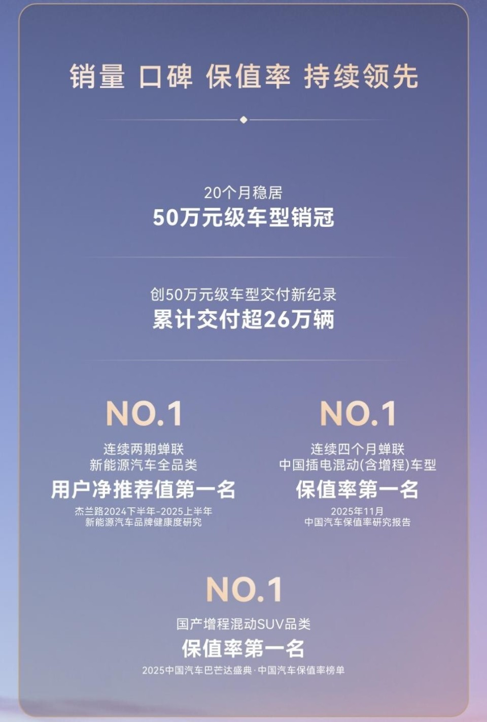两年来,问界M9不仅赢得了市场,更获得了用户的高度认可。在杰兰路2024下半年-2025上半年新能源汽车品牌健康度研究中,问界M9连续两期获得新能源全车型用户净推荐值第一。此外,在中国质量协会发布的2025年中国新能源汽车行业用户满意度指数评测结果中,问界M9荣获第一名,在J.D. Power 魅力指数榜单中位列豪华插电混动SUV第一……这一系列殊荣,共同印证了这款现象级产品在新能源豪华车市场的领先实力,展现独特的标杆魅力。