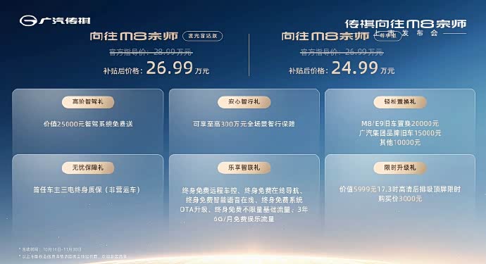 10月16日,广汽传祺旗下中大型MPV——传祺向往M8宗师版正式上市。新车定位中大型MPV市场,共推出两款配置车型,分别为尊享版与激光雷达版,补贴价为24.99、26.99万元。