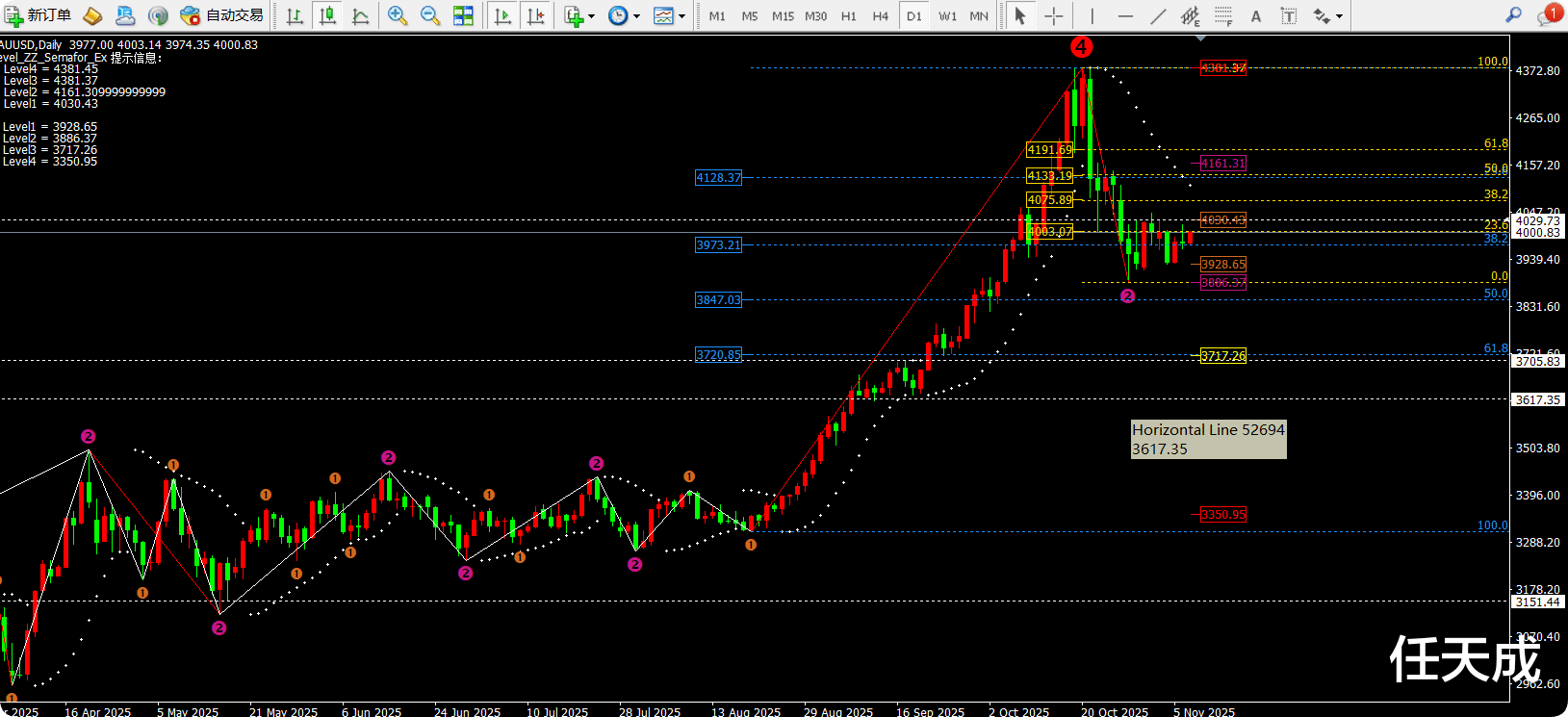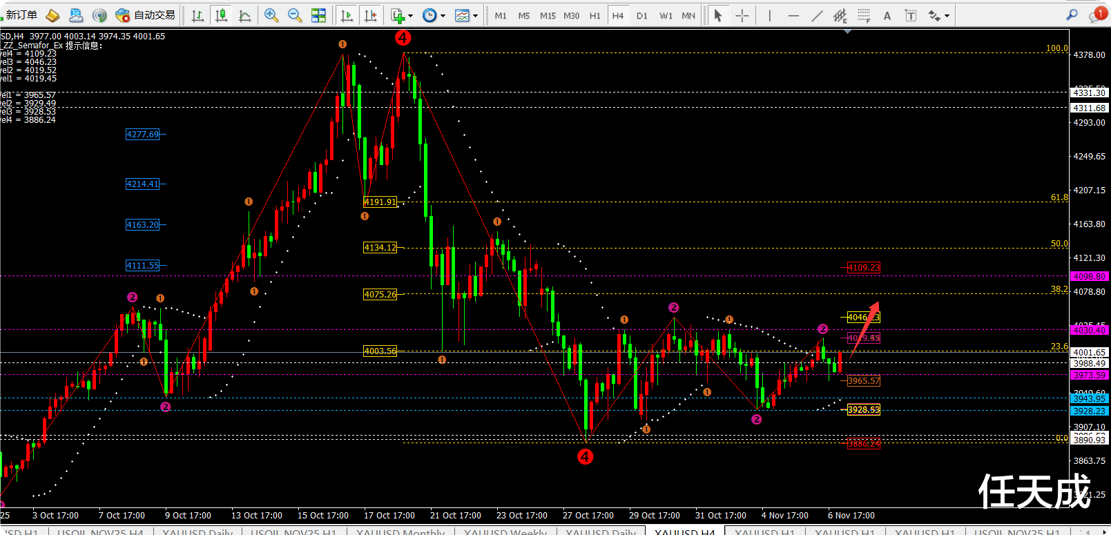①日线昨日收线十字星符合天成昨日分析,不会超过4030一线。而今日日线指标macd死叉缩量震荡,灵动指标sto快线出现折线向上拉升代表日线级别有反弹的迹象。那么今日的日线中轨和均线MA30就是今日的目标点位对应4030-4082一线。