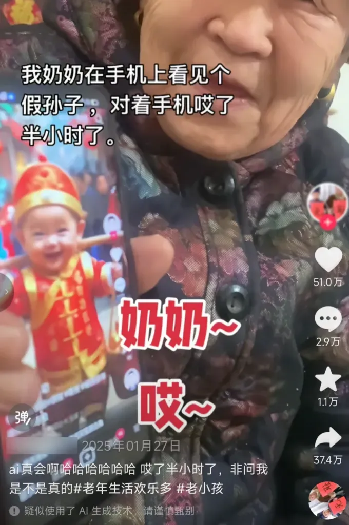 即使你跟咱奶说,“奶啊,谁家好小孩,路都走不稳,就能做饭呢?都是AI的,都是假的!”