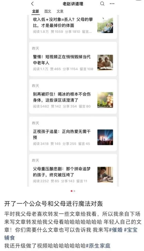 其自创公众号@老赵讲道理,用AI生成老年人最爱看的同风格营销号内容,反向“洗脑”劝导父母,竟然实现了一夜涨粉10W?