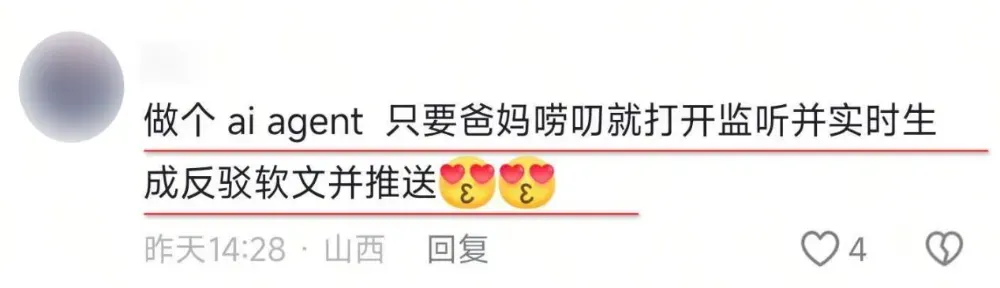 而还有网友提出,“应该再加一个AI Agent,只要爸妈唠叨就打开监听并实时生成反驳软文并推送。”