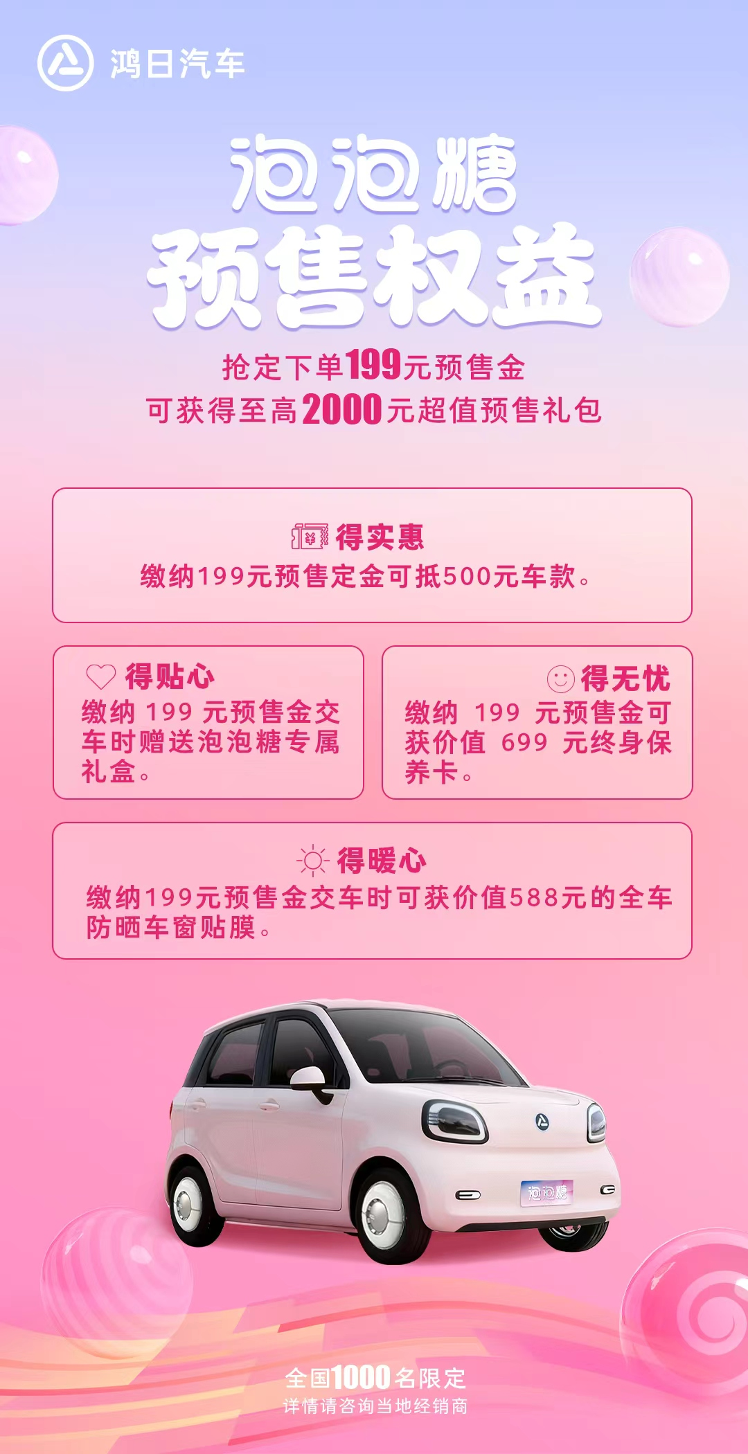 值得一提的是,更多产品细节将在本次上市发布会中重磅揭晓。目前,泡泡糖已正式开启预售,用户抢定下单 199 元预售金,可获得至高 2000 元超值预售礼包,包括“可抵 500 元车款、交车时赠送泡泡糖专属礼盒、价值 699 元终身保养卡和价值 588 元的全车防晒车窗贴膜”等多重福利,体现出鸿日汽车满满的“宠粉”诚意。