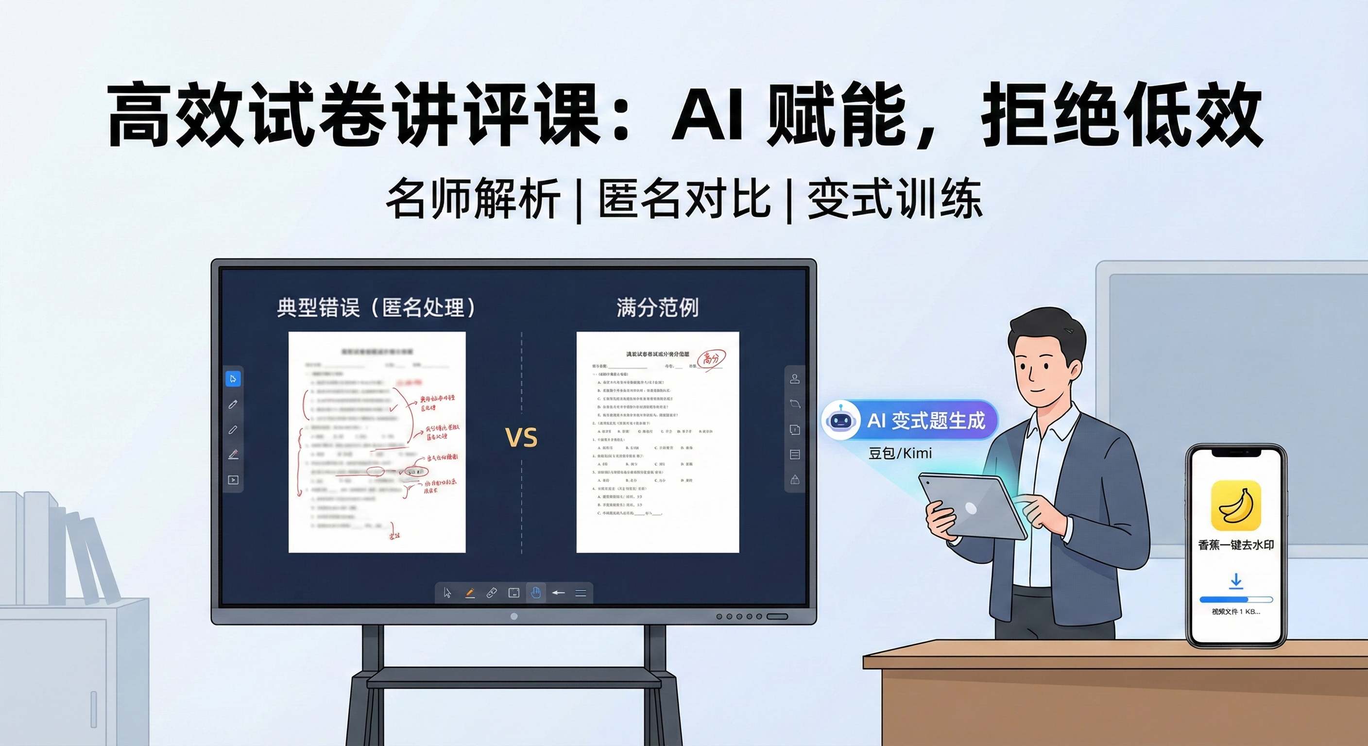 环节传统做法高效方案核心工具讲难题老师干讲播放名师无水印 MP4 解析香蕉一键去水印展试卷模糊不清AI 修复 试卷图片/去隐私香蕉一键去水印练变式翻练习册AI 实时生成 同类题豆包 / Kimi试卷讲评不是为了纠正过去,而是为了启发未来。当我们用更直观、更多元的方式去呈现解题思路,学生自然愿意跟着你的节奏走。如果你觉得这个思路能拯救你的讲评课,麻烦点个赞或转发给你的学科组,好方法值得共享。