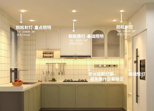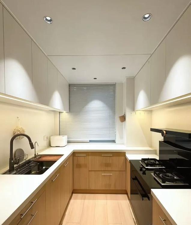 比如如果只用单一的顶灯作为光源,就很容易造成整个厨房都是一片阴影和暗区,不仅看起来杂乱无章,还会影响到厨房操作的安全性。
