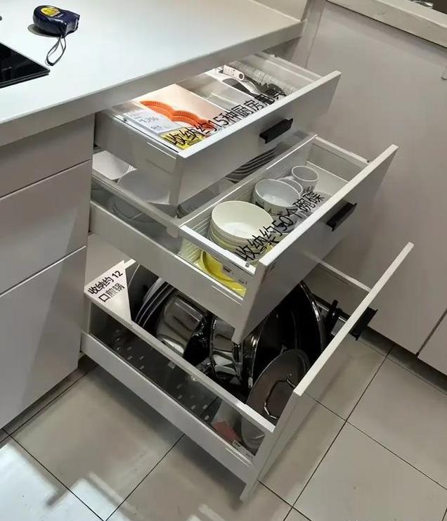 如果橱柜抽屉过多,每个抽屉还存放不同种类的物品,就很容易出现拿取困难的问题,反而不如几个大抽屉来得实用。